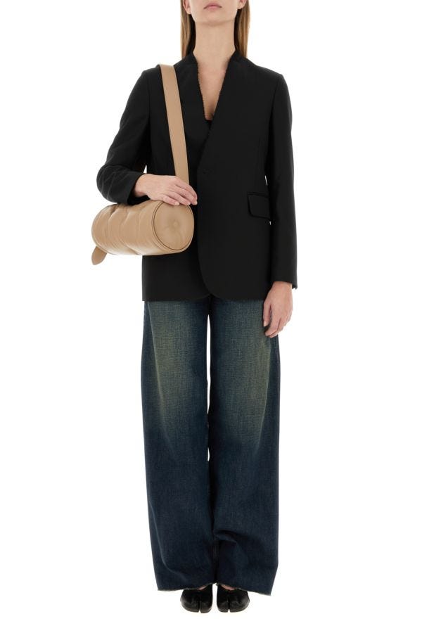 キルティングナッパレザーを使用したクロスボディバッグ。フロントにはコントラストの効いたロゴラベルが付いています。