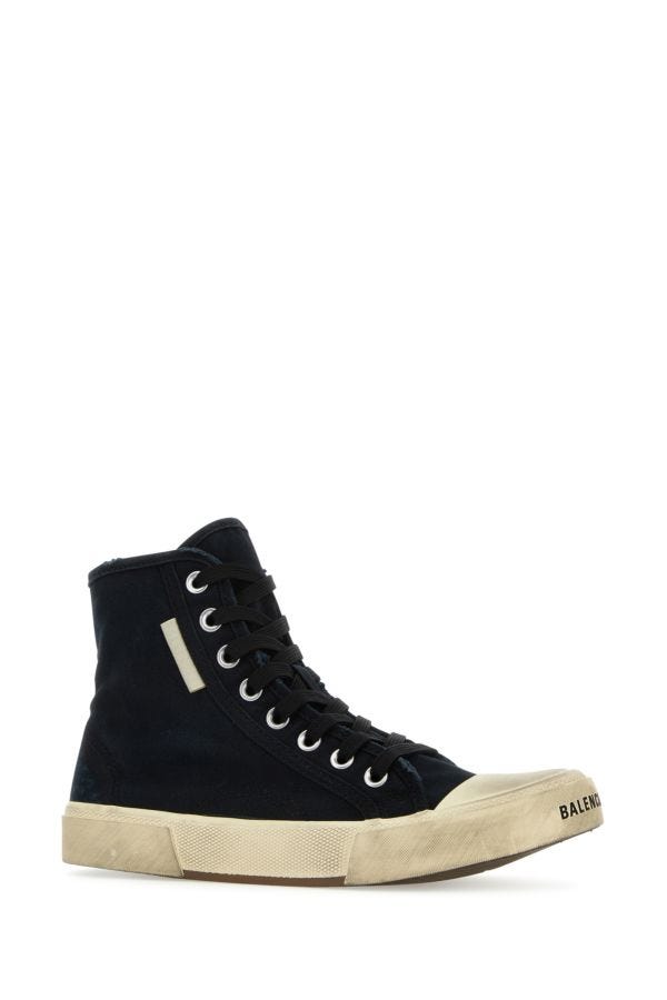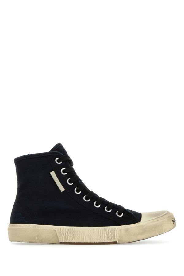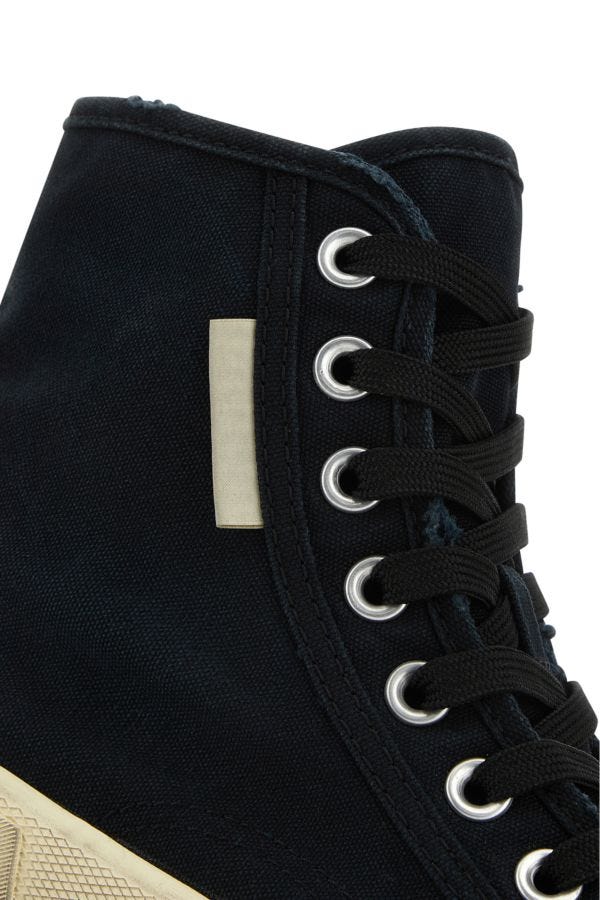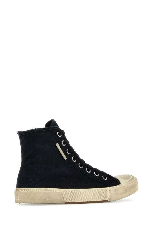 ストーンウォッシュ加工とダメージ加工を施したピュアコットンキャンバスを使用したハイトップスニーカー。つま先にロゴプリントが入っています。
