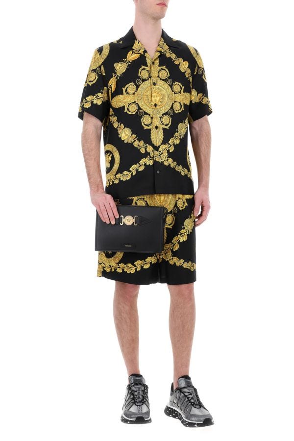 滑らかなカーフレザーで作られたクラッチ。フロントには象徴的なメタルのメデューサヘッドがあしらわれています。