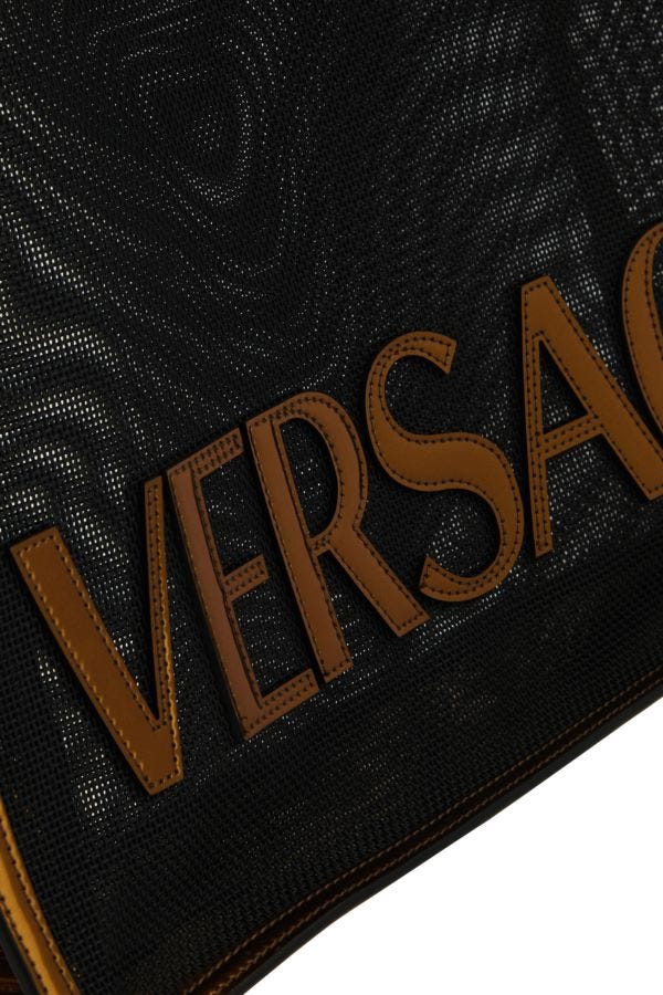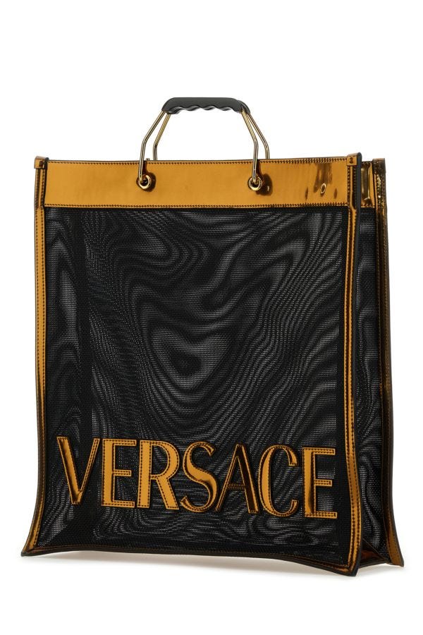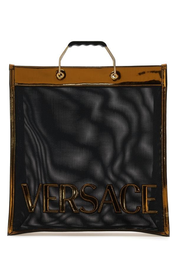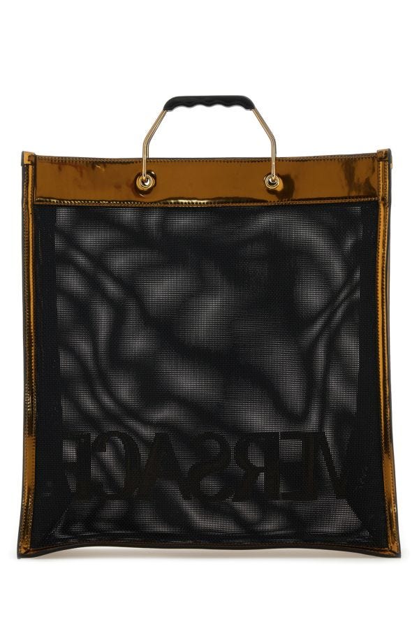 前面にラミネート加工のロゴパッチが付いたメッシュの半透明ショッピングバッグ。