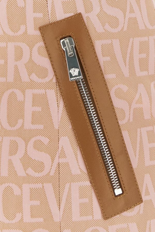 ヴェルサーチの特徴である滑らかなレザーインサートをあしらったポリエステル混紡のミニドレス。全面に刺繍、フロントとバックに独特のカットアウトディテール。フロントとショルダーストラップに象徴的なメデューサヘッドメタルディテールが施されています。