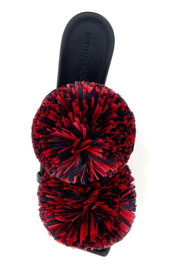滑らかなラムレザーで作られたミュール。フロントに装飾的なラフィアポンポンが付いています。