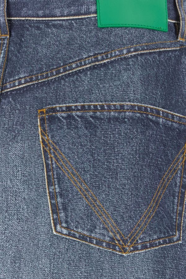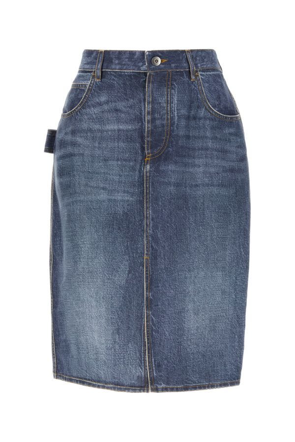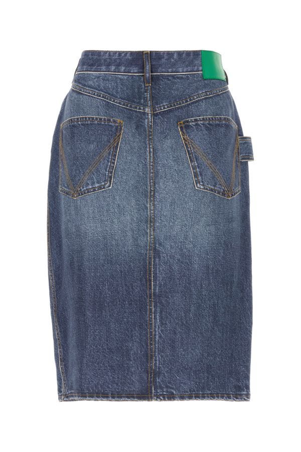 デニム風クレープ素材のスカート。背面にレザーのロゴ入りラベルが付いています。