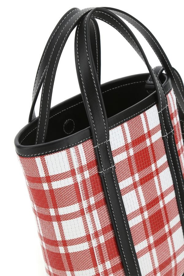 フロントにロゴプリント、全面にタータン柄プリントが施されたカーフレザーの編み込み製ショッピングバッグ。