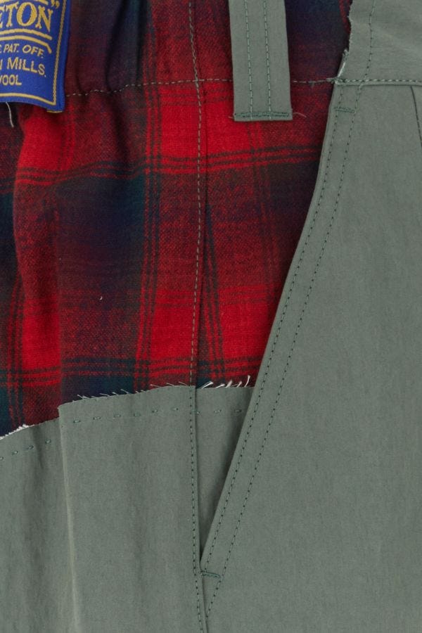 タータン柄のウールインサートをあしらったコットン混紡のワイドレッグパンツ。背面には象徴的なステッチが施されています。