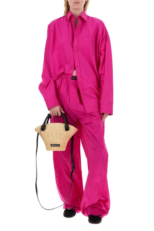 前面にコントラストの効いたロゴ入りラベルがついた麦わら製のハンドバッグ。